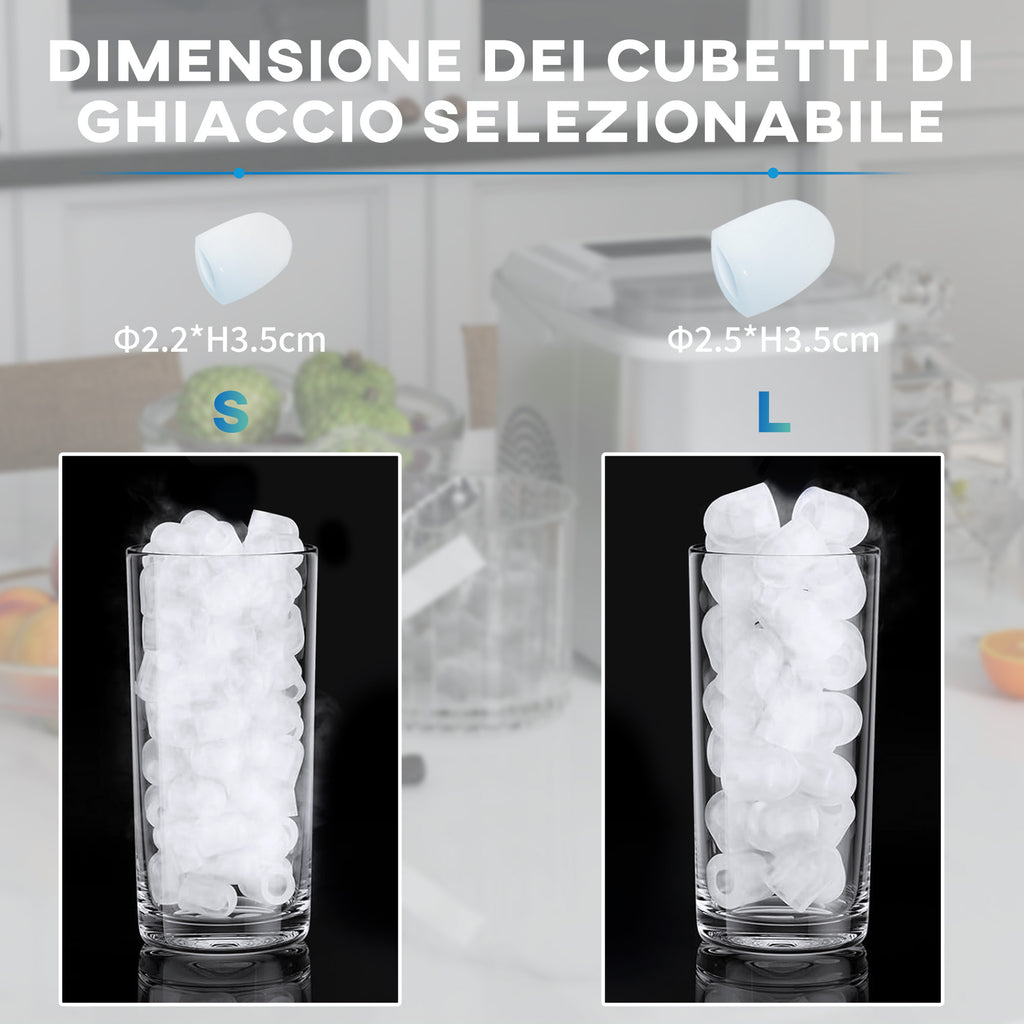 - OPTIONAL DISPONIBILI: Questa macchina per il ghiaccio portatile offre una selezione di 2 dimensioni diverse di cubetti di ghiaccio. La macchina dispone inoltre di una comoda modalità di autopulizia, attivabile premendo il pulsante "ON/OFF" per 5 secondi, eliminando così tutti i batteri entrati in contatto