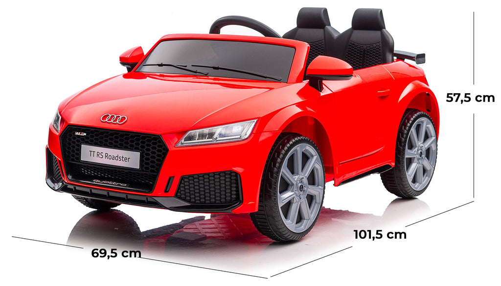 L'Audi TT RS Roadster a due motori ha una velocità massima di 6 km/h, grazie alla sua batteria da 12V-7AH. La batteria offre un'autonomia di un'ora e viene fornito con un caricabatterie da 12 Volts. Con un fusibile di protezione motore, garantisce la sicurezza durante l'uso. Il veicolo ha un design realistico con portiere apribili e dispone di luci a LED, display retroilluminato, luci e suoni. Inoltre, è dotato di un radiocomando bluetooth, lettore MP3 con attacco per Sd Card e Usb e cinture di sicurezza. Facile da trasportare grazie alla maniglia dedicata. Licenza AUDI.
