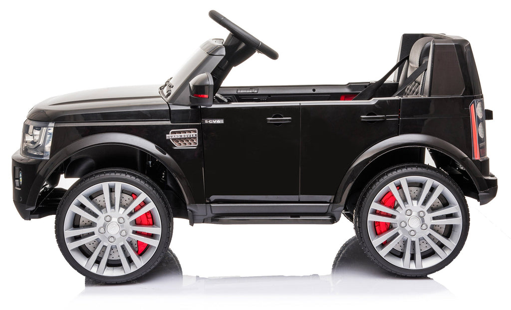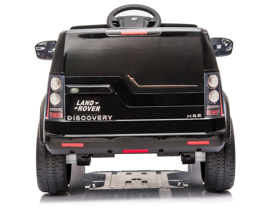 Macchina Elettrica per bambini di colore nero che riproduce la possente Land Rover Discovery con radiocomando per la guida a distanza del genitore.