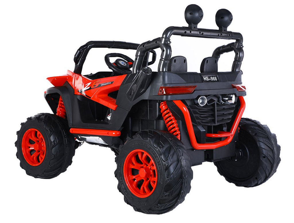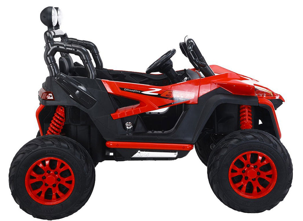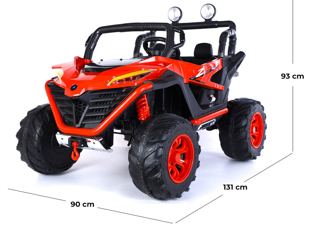 Um ein zeitloses Abenteuer zu erleben, ist das ferngesteuerte Auto mit vier großen Kunststoffrädern mit Gummimittelteil und ergonomischem Sitz, LED-Scheinwerfern am Vorderbügel und Federungen zur Anpassung an jeden Boden ausgestattet.
