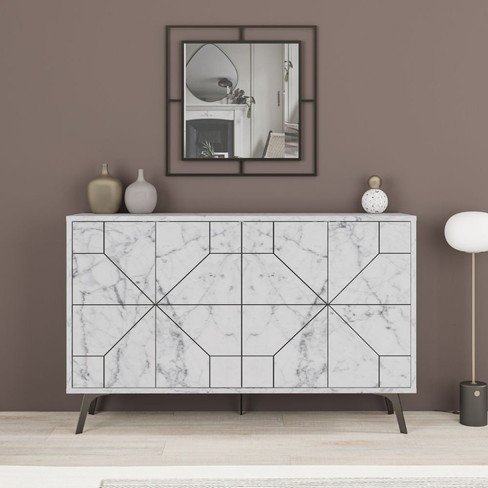 La madia Dune è una cassettiera composta da 4 ante, disponibile nel colore bianco carrara, che dona un effetto marmo elegante. Realizzata in truciolare di alta qualità, presenta un rivestimento melaminico resistente. Le ante sono caratterizzate da un disegno geometrico che conferisce un tocco di originalità. La madia è dotata di piedi in metallo nero, che le conferiscono solidità e stabilità. Le sue dimensioni compatte di 123x35x77,4 cm la rendono adatta sia a spazi ridotti che a ambienti più ampi. Con un peso di 43 kg e una capacità massima di 60 kg, la madia Dune è una scelta pratica e funzionale per l'arredamento della casa.
