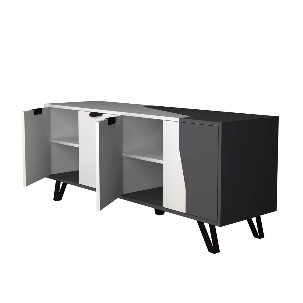 Madia dal design unico. Il colore bianco viene macchiato dalla tinta ghisa in modo irregolare, conferendo un gioco di forme davvero originale. Anche la particolare forma dei piedini e delle maniglie in metallo nero, rendono questa madia davvero esclusiva. Dotata di 4 ante e vani molto capienti.