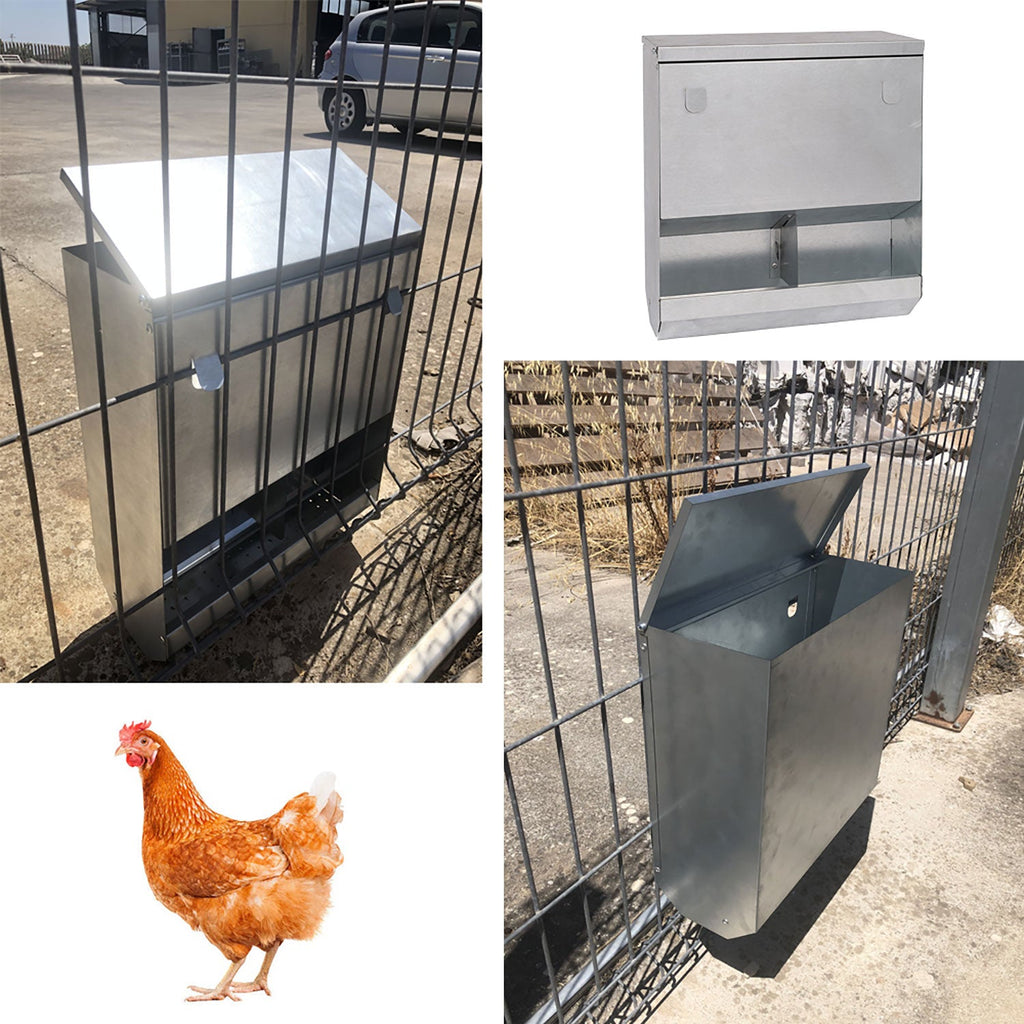 La mangiatoia per polli di ha una capacità da 8 litri e può consentire a polli o galline di mangiare insieme in qualsiasi momento. La nostra mangiatoia per pollame è realizzata in lamiera zincata resistente e durevole, e fornisce una protezione dall'acqua per mantenere il mangime asciutto. Progettata per permettere l'inserimento del mangime dall'esterno della gabbia per una maggiore comodità, grazie al meccanismo a caduta elimina gli sprechi di cibo. Sollevata dal suolo grazie ai sostegni garantisce una maggiore pulizia. Il design completo di questa mangiatoia per polli all'aperto li farà crescere in modo sano.