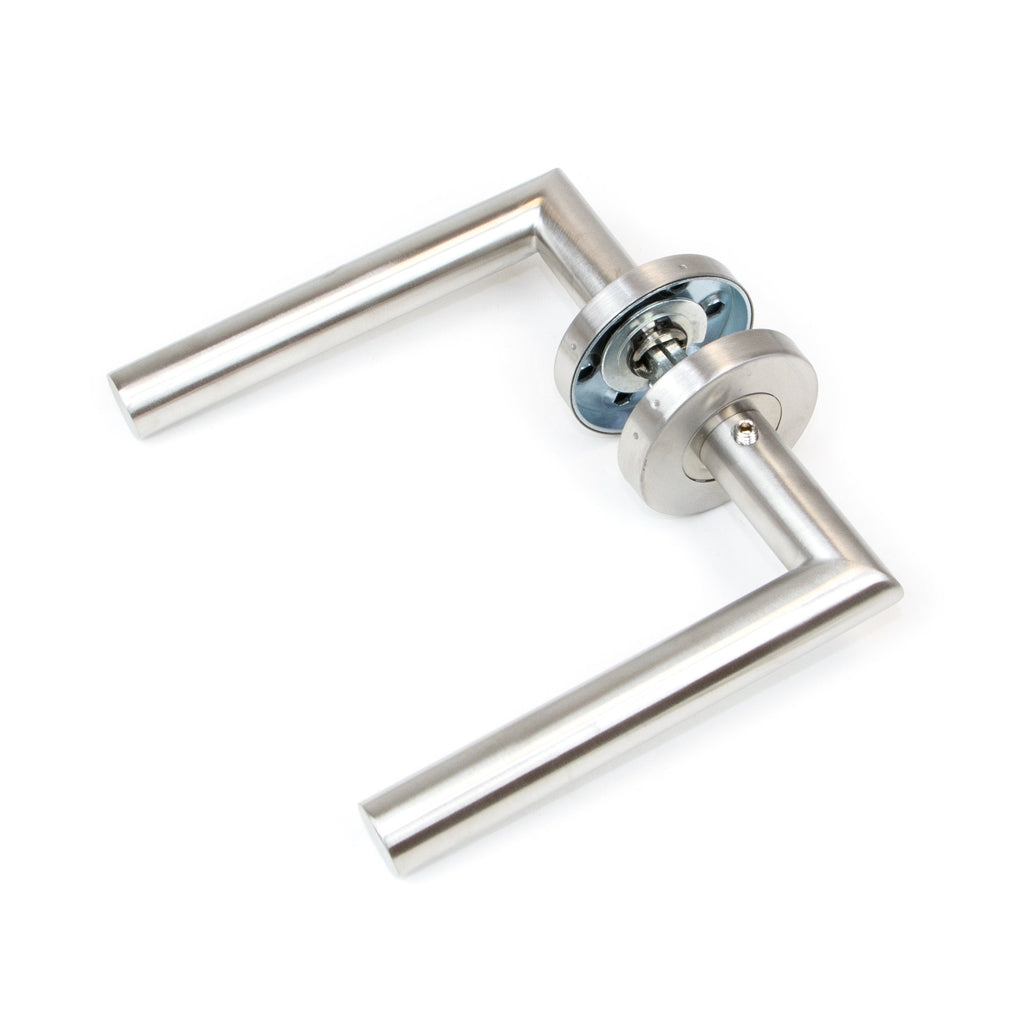 Paar gerade L-förmige Griffe für Innentüren mit runder Rosette mit 53 mm Durchmesser. Sie eignen sich für Türen mit einer Dicke zwischen 35 mm und 45 mm und verfügen über eine Rückholfeder, um den Griff in seine horizontale Position zurückzubringen.