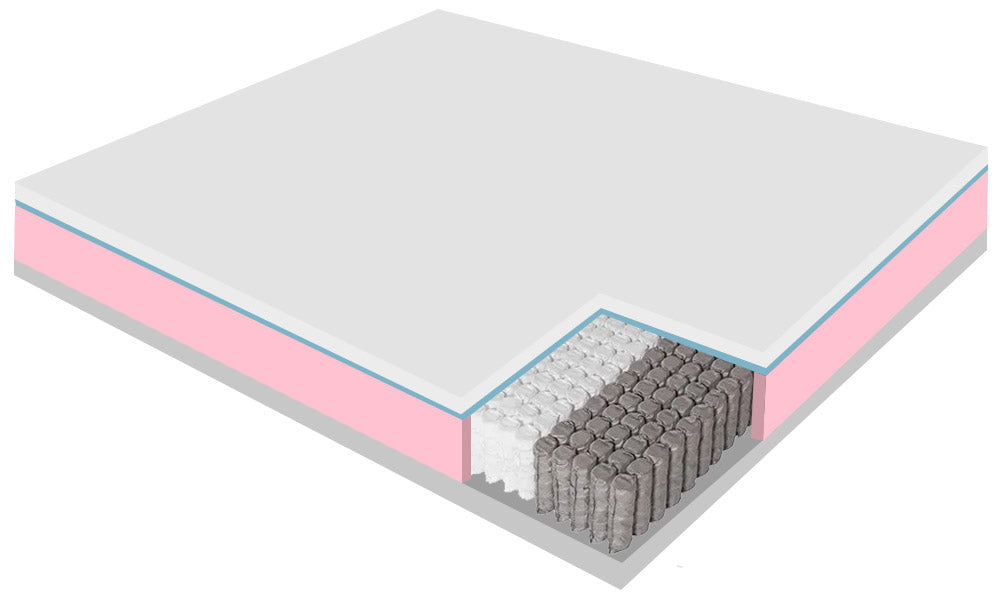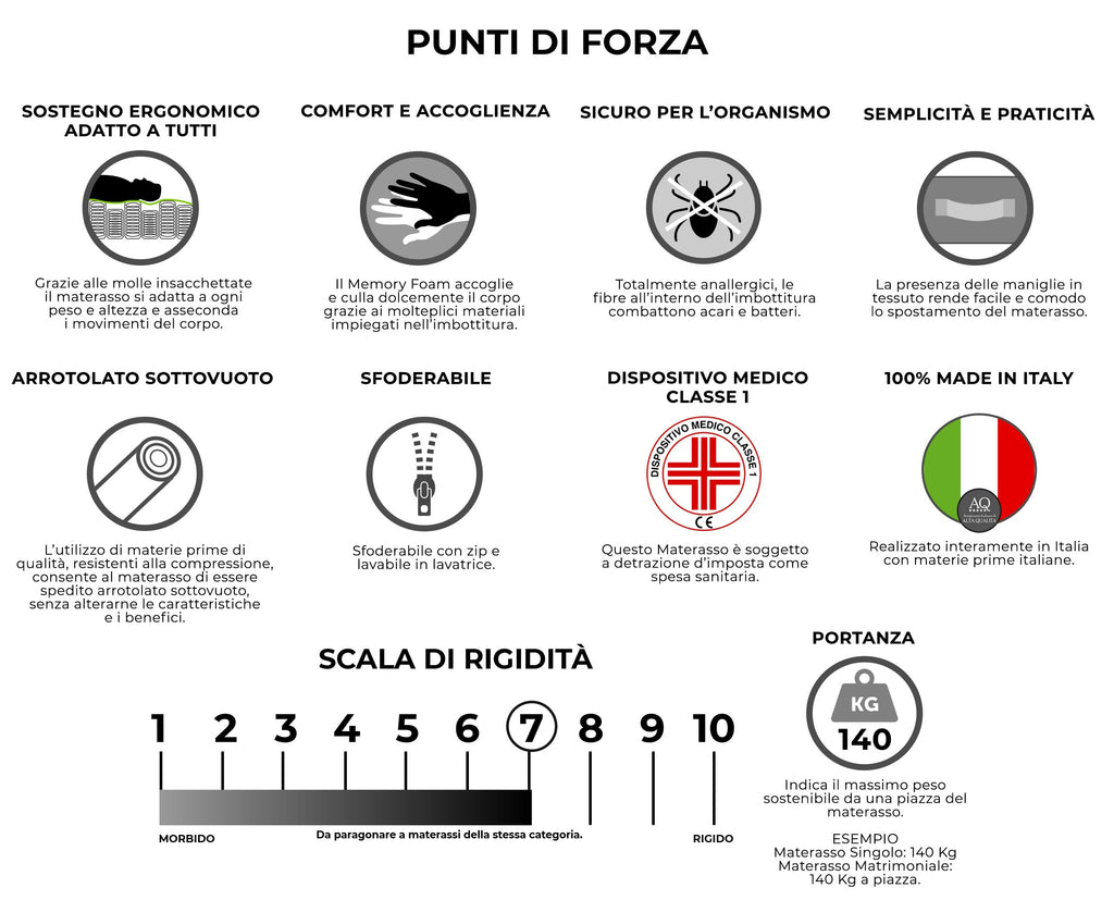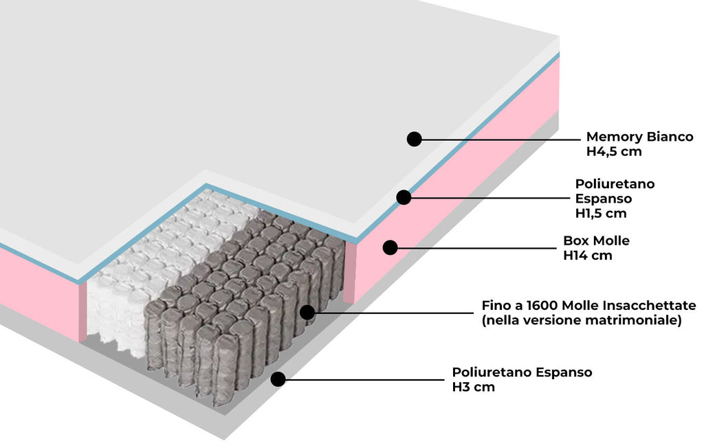Eternity ist eine Matratze mit unabhängigen Taschenfedern, die jeweils in einem Baumwollbeutel eingeschlossen sind, die unabhängig voneinander wirken, Ihren Körper sanft beruhigen, sich geräuschlos an jede Bewegung des Körpers anpassen und unabhängig von jedem empfangenen Druck wirken, ohne die anderen zu erbitten. Die 1600 Federn (in der doppelten Version) bestehen aus gehärtetem Stahldraht und sind unterschiedlich dick, in 7 differenzierten Bereichen angeordnet, um eine präzise Reaktion auf Belastung zu gewährleisten. Sie wurden entwickelt, um einen anatomischen Effekt zu bieten und sich daher besser an die unterschiedlichen Drücke anzupassen, denen sie ausgesetzt sind. Auf diese Weise wird dem Körper geholfen, sich an jedem Punkt mit der richtigen Unterstützung auszuruhen.