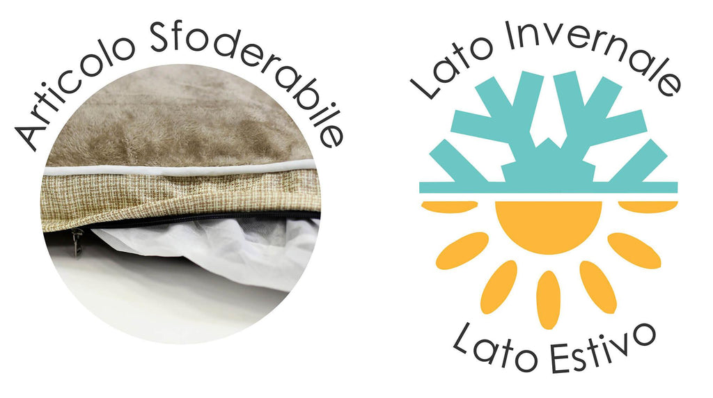 Ideal für Sommer und Winter, da es einen oberen Teil aus warmem Winterstoff und einen unteren Teil aus frischem, wasserdichtem Stoff hat. Der Artikel hat dank des praktischen Reißverschlusses komplett abnehmbare Bezüge.