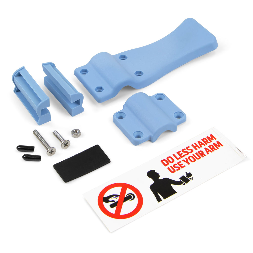 Der Mechanismus besteht aus hochfestem blauem Kunststoff und enthält einen Warnaufkleber und eine Montageanleitung .