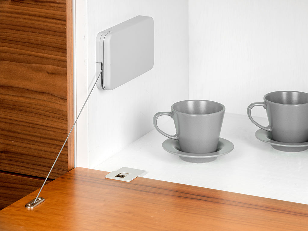 Mechanismus für Klapptüren mit Stahlseil . Der Mechanismus bietet eine funktionale und sehr innovative ästhetische Lösung. Ideal für Küchen- und Wohnzimmermöbel.
