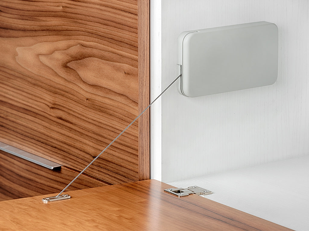 Mechanismus für Klapptüren mit Stahlseil . Der Mechanismus bietet eine funktionale und sehr innovative ästhetische Lösung. Ideal für Küchen- und Wohnzimmermöbel.
