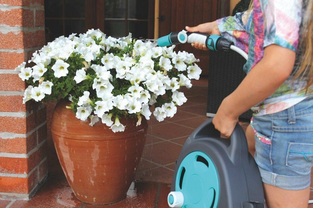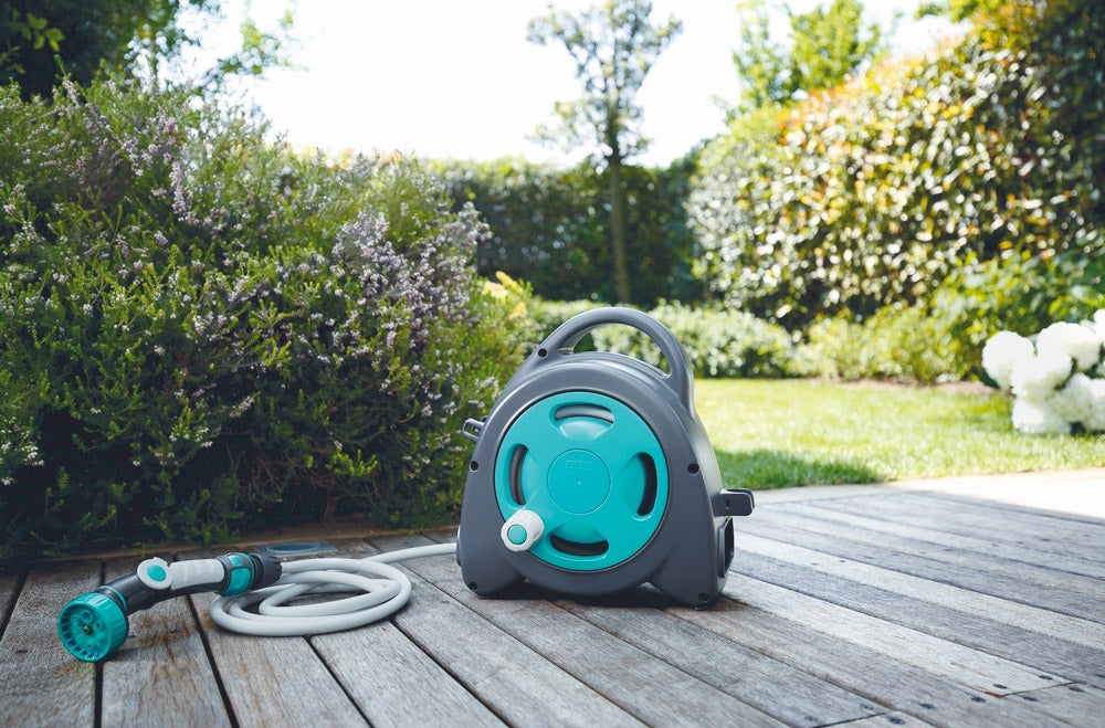 Mini-Schlauchtrommel „AQUA BAG“. Der Schlauchaufroller in der neuen Mini-Version ist ideal zum Gießen von Pflanzen, Blumen und Töpfen auf Terrassen, Balkonen, Veranden und kleinen Gärten. Dank der dualen Nutzungsart, die auf den Boden gestellt oder transportiert werden kann, ist er äußerst praktisch im Gebrauch, da er kompakt, leicht und mit einem neuen faszinierenden Design ist, das Outdoor-Momente noch angenehmer macht.