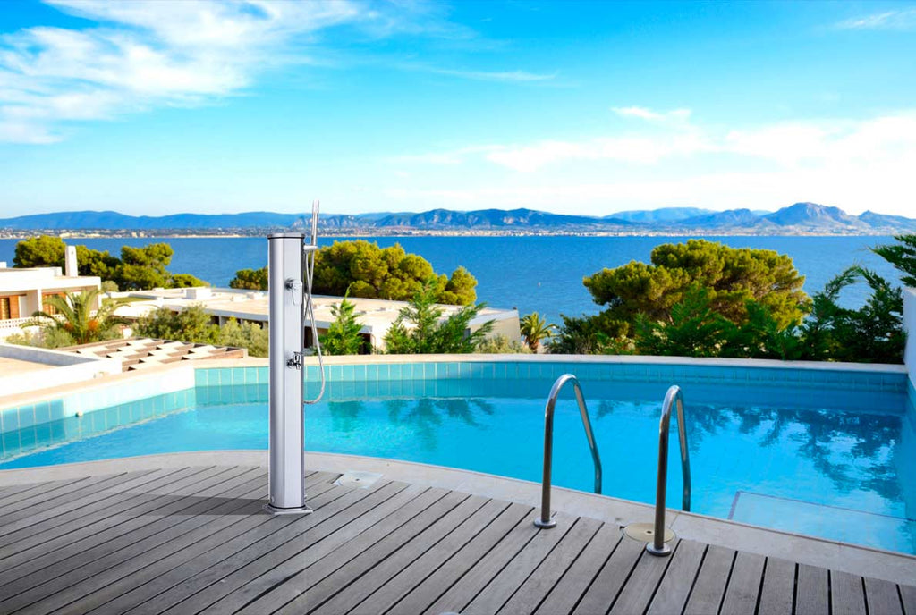 Solarbeheizte Mini-Dusche für Garten-Schwimmbad 20 l mit Warm-Kalt-Mischer, Fußwaschanlage und Handbrause aus metallischem Aluminium