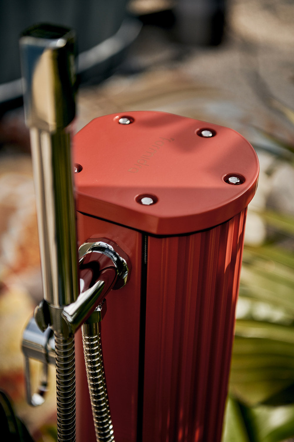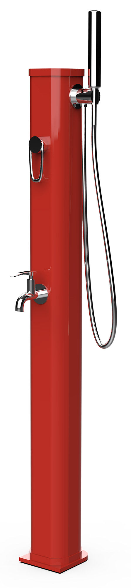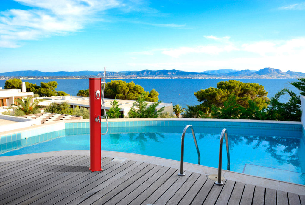 Mini Doccia a Riscaldamento Solare da Giardino e Piscina 20 litri con Miscelatore Caldo-Freddo Lavapiedi e Doccetta. Questa doccia solare unisce design elegante e ingombro ridotto. Consegnata con la sua doccetta rimovibile, il suo utilizzo è semplice e giocoso.