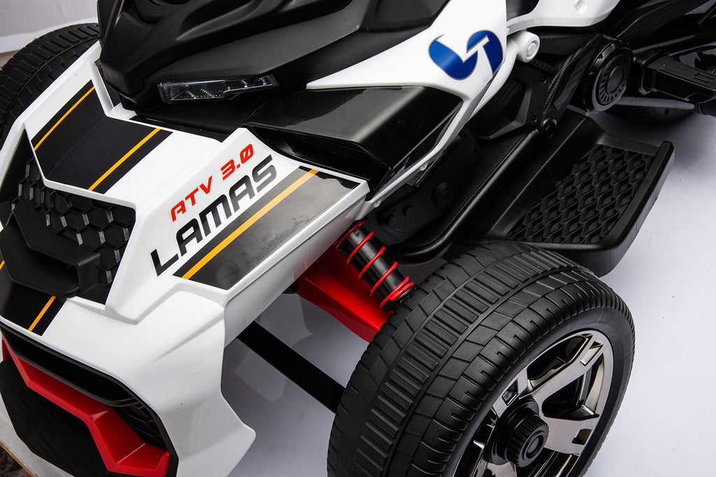 Mini quad elettrico per Bambini con 3 ruote grandi, a batteria 12V. Questo Quad monoposto è dotato di illuminazione con luci led, suoni predefiniti e MP3. Accelerazione facile con pedale, doppia velocità e tasto per andare avanti e indietro.