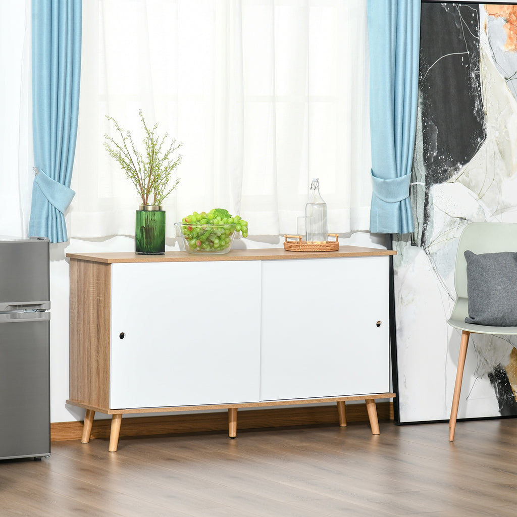 Bringen Sie mit dem modernen Sideboard frischen Wind in Ihr Zuhause. Dieser Küchenschrank lässt sich ideal mit verschiedenen Arten von Möbeln kombinieren und eignet sich perfekt für verschiedene Umgebungen, vom Wohnzimmer bis zum Wohnzimmer. Es verfügt über 4 höhenverstellbare Regale, die sich perfekt zur Aufbewahrung von Geschirr, Besteck oder Tischdecken eignen. Mit seinen Schiebetüren ist der Buffetschrank leicht zu öffnen und praktisch im täglichen Gebrauch. Warten Sie nicht länger, um Ihre Räume mit dem Stil und der Funktionalität dieses Sideboards zu renovieren!