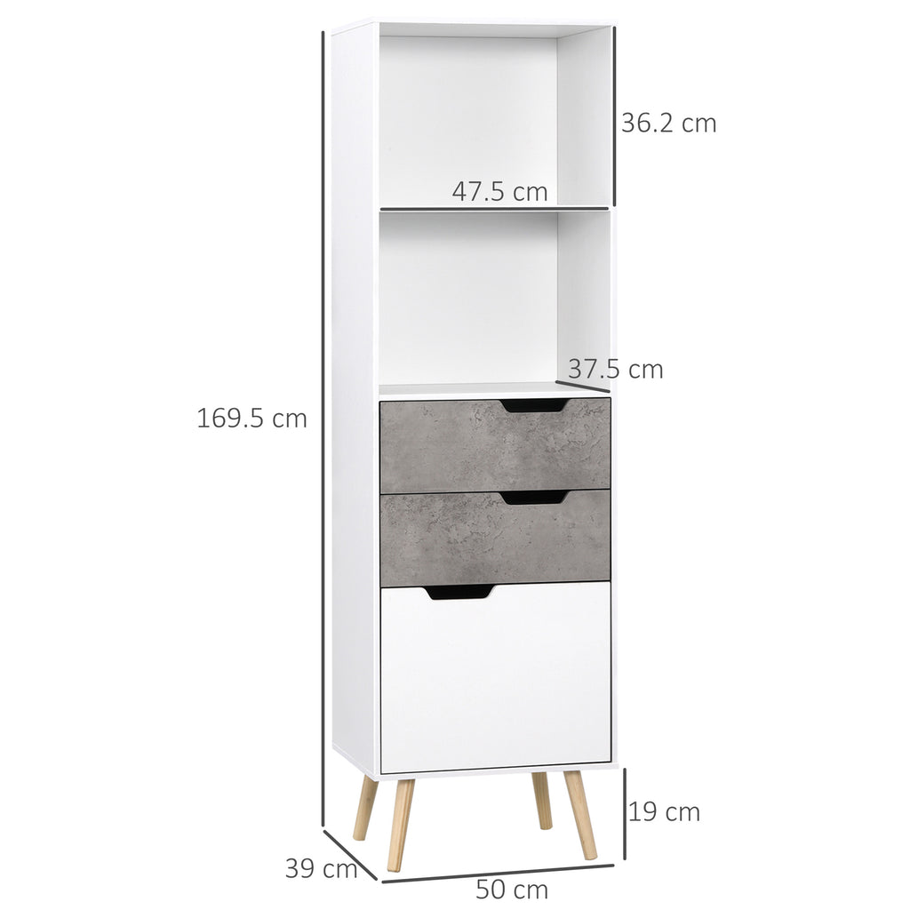 Schrank 3 Schubladen und 2 Regale 50 x 39 x 169,5 cm in weißgrauer Spanplatte und Kiefernholz