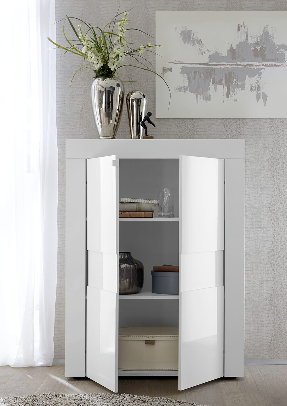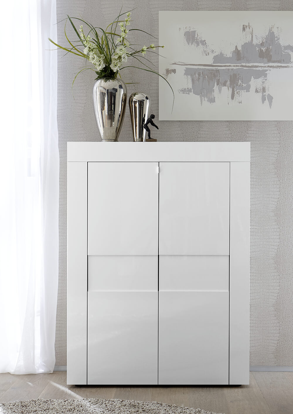 Hoher Wohnzimmerschrank mit 2 Türen 92 x 42 x 125 cm aus kratzfestem Melamin in TFT-Bauweise in glänzendem Weiß