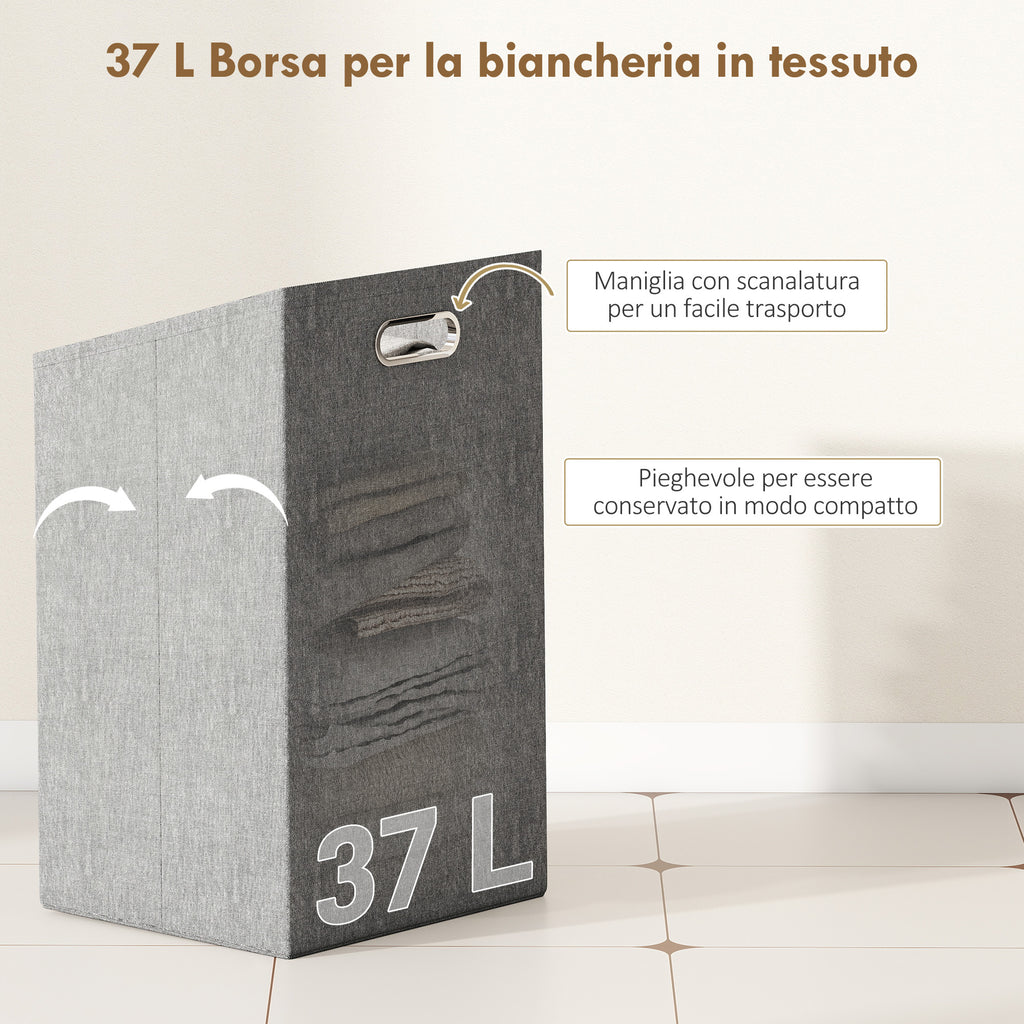 Mobile Bagno a Doghe con Cesto Portabiancheria 40x30x95 cm Apertura a Ribalta in Bambù e Poliestere Grigio e Legno