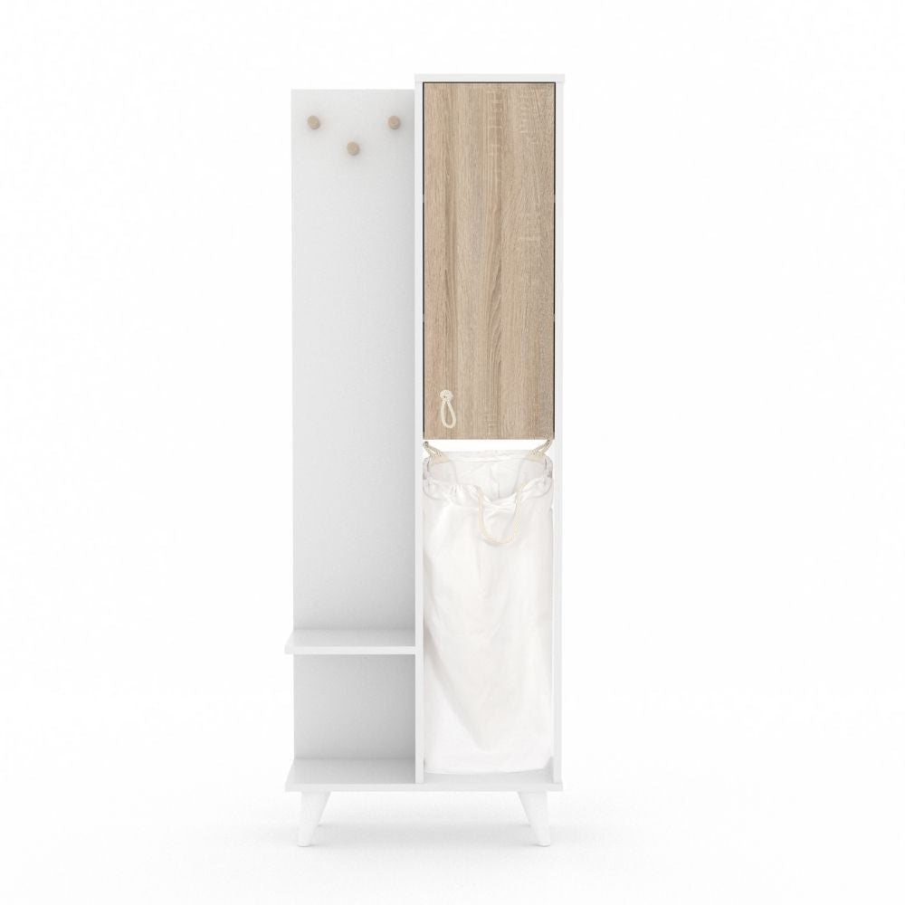 Mobile bagno dal design unico. Nella parte destra troviamo una colonna composta da comodi ripiani chiusi da un’anta, mentre nella parte bassa una capiente cesta per il bucato. Nella parte sinistra invece, un vano a giorno e tre utili appendi asciugamani con colore a contrasto. Molto bella è la maniglia in corda per aprire l’anta.