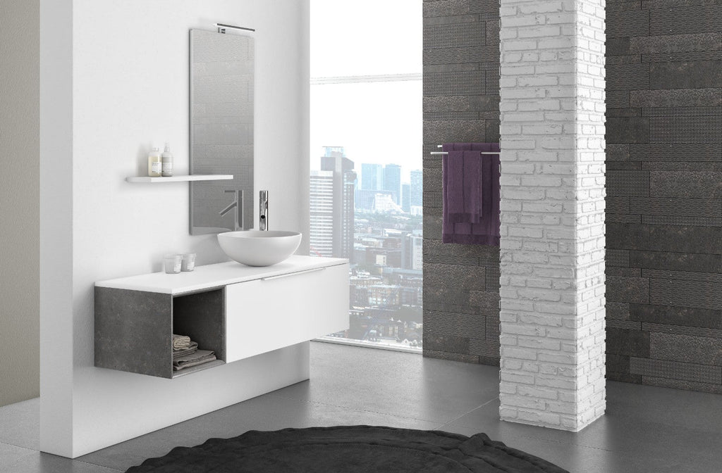 Badezimmer-Hängeschrank mit LED-Lampe mit Waschbeckenspiegel und linker Ablage 135 x 46 x 190 cm in TFT Mactan Wood Mattweiß und Grau