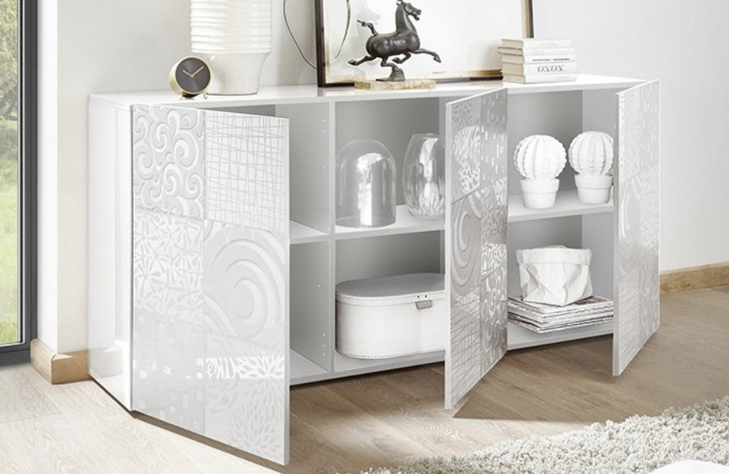 - La madia e serigrafata e in finitura bianco lucido.
