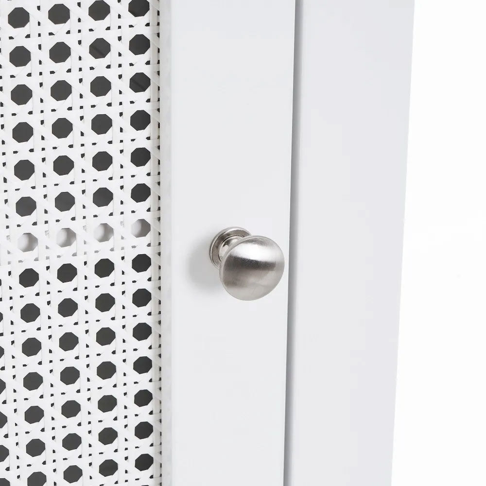 La porta dell'armadio da bagno dispone di 2 solide cerniere in metallo e chiusura magnetica per essere facile da aprire e chiudere, la maniglia è a pomello, in acciaio cromato argentato, e sul retro è dotato di tasselli per fissarlo alla parete e impedire che si ribalti.