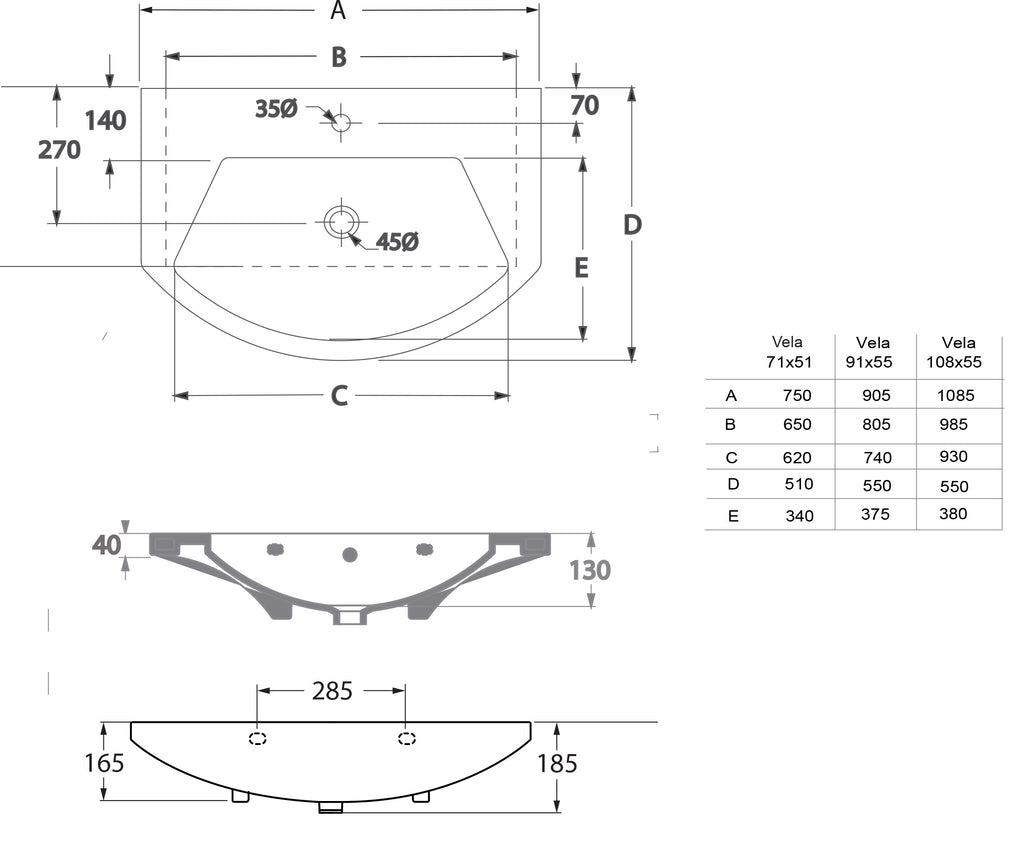 - Waschbecken aus Keramik (mittig LxB): 108 x 56 cm