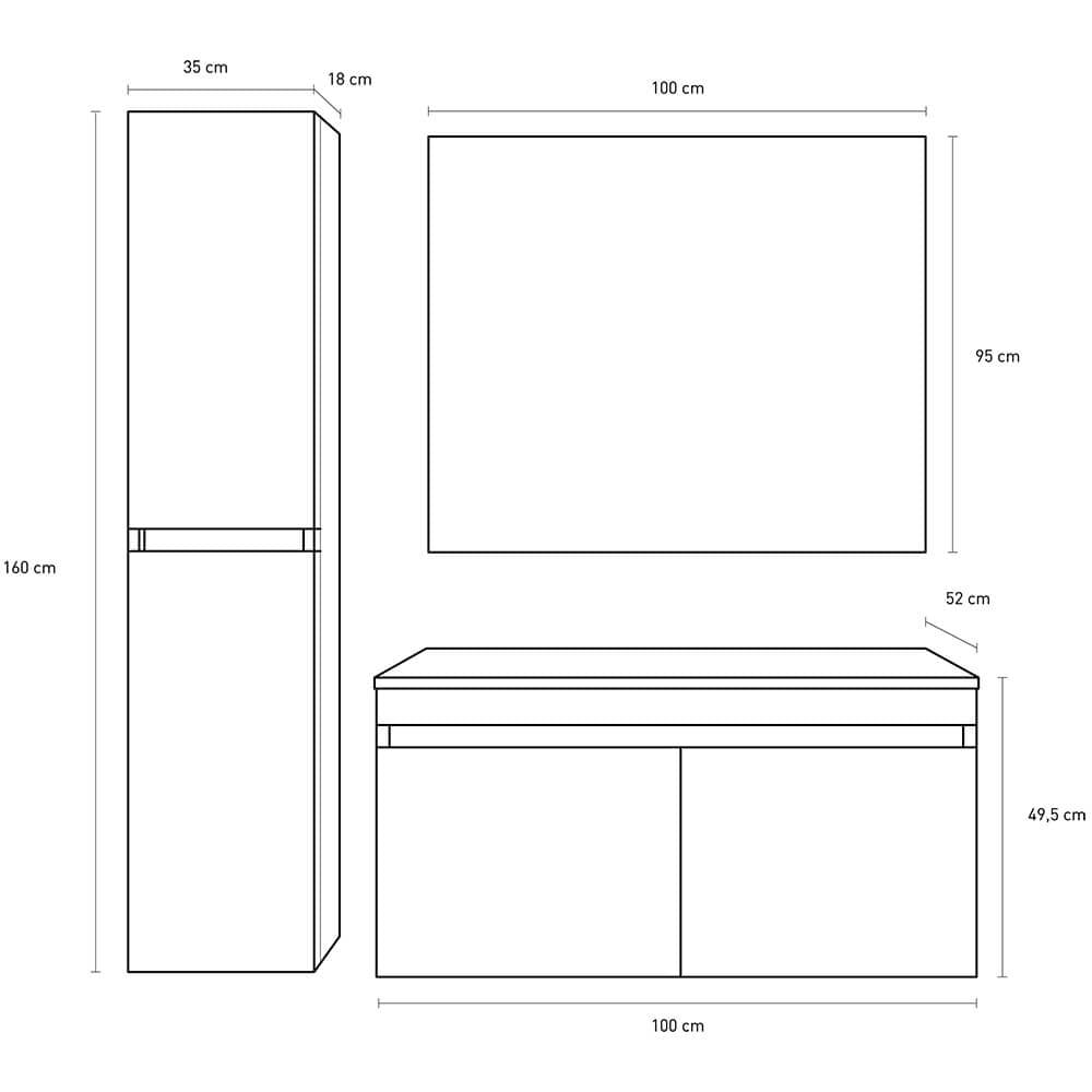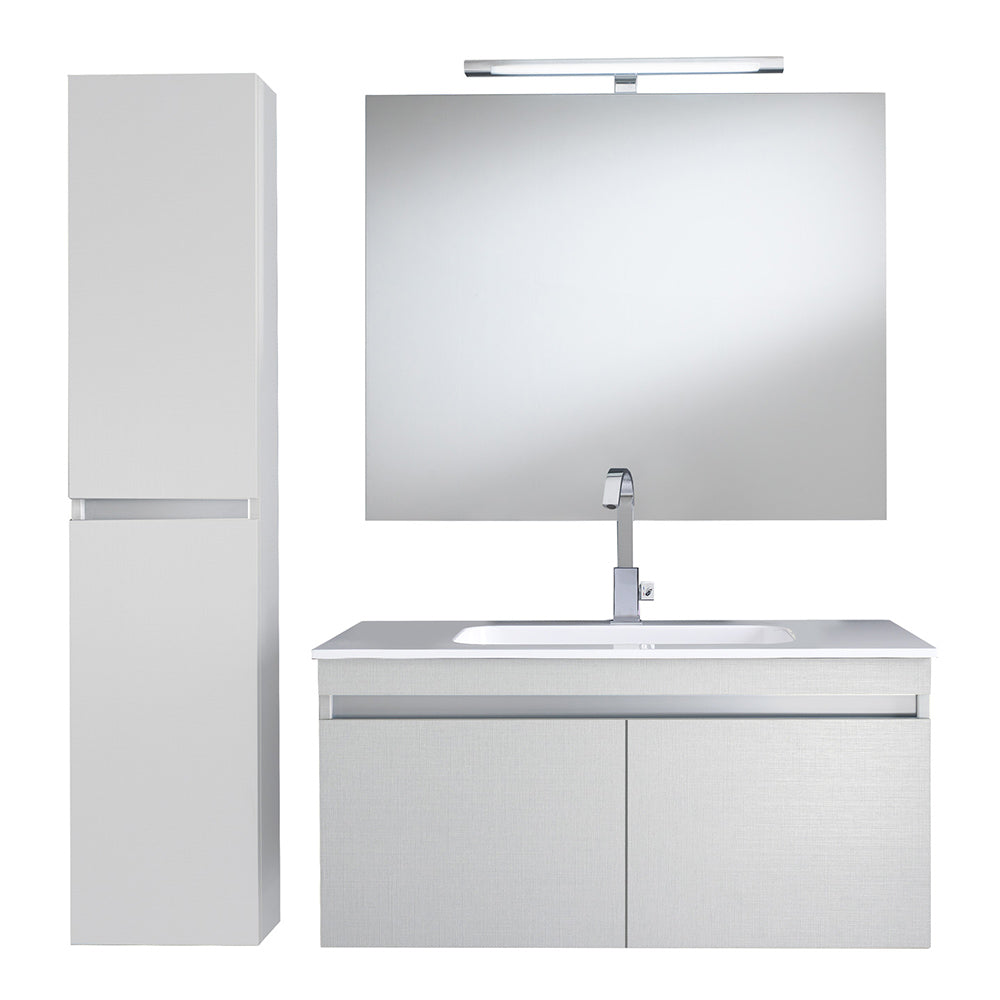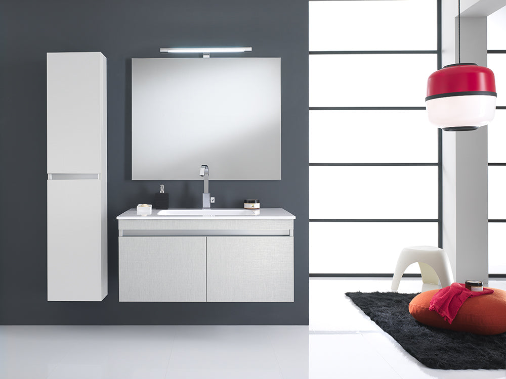 Bali 06 Maxi hängende moderne Badmöbel komplett mit Hängesäule, Hängeschrank mit Stonelight-Waschbecken und Spiegel mit Beleuchtung.