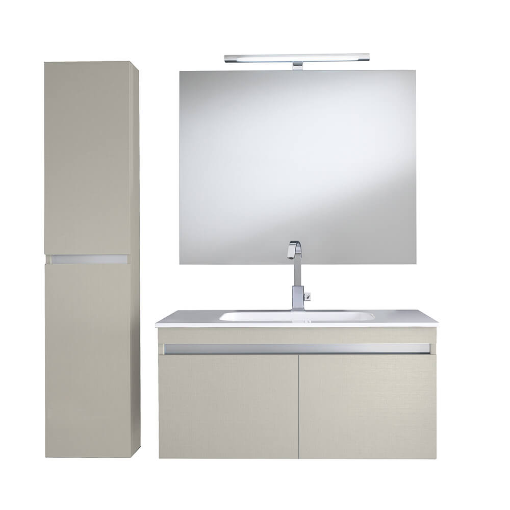 Bali 06 Maxi hängende moderne Badezimmermöbel komplett mit Hängesäule, Hängeschrank mit Stonelight-Waschbecken und Spiegel mit Beleuchtung.