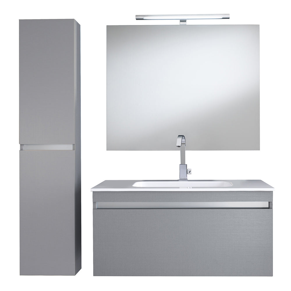 Bali 06 Maxi hängende moderne Badmöbel komplett mit Hängesäule, Hängeschrank mit Stonelight-Waschbecken und Spiegel mit Beleuchtung.
