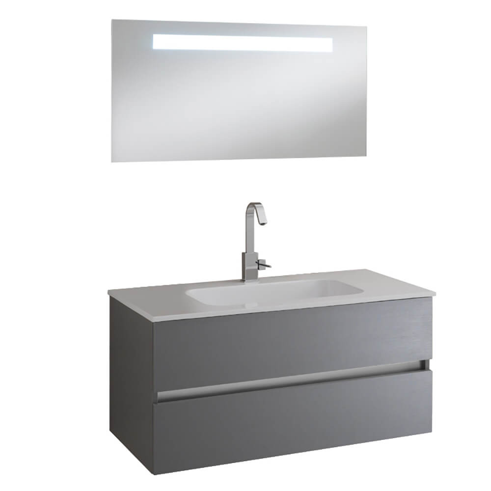 Moderne Badezimmermöbel Bali 10C kompletter Hängeschrank mit zwei Schubladen mit Stonelight-Waschbecken und hinterleuchtetem Spiegel.