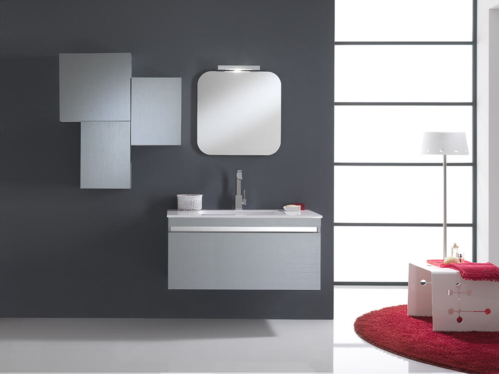 Bali Mix moderne Hängebadmöbel komplett mit 3 Hängeschränken, Hängemobil mit Stonelight-Waschbecken und Spiegel mit Beleuchtung.