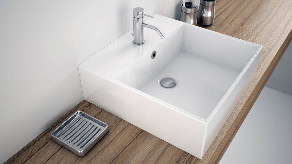 Giava 11 moderne Badmöbel komplett mit Klappunterschrank und Keramikwaschbecken, eintürigem Spiegel und LED-Leuchte.