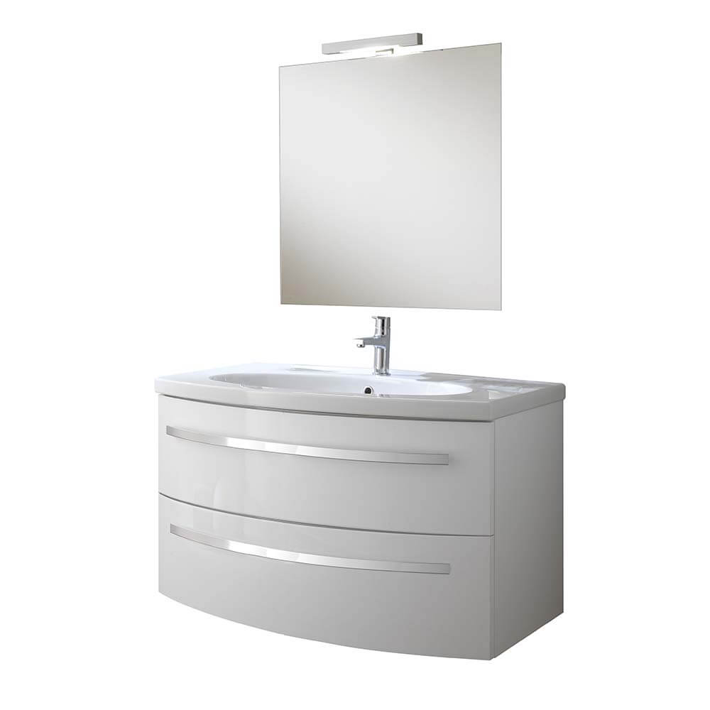 Moderne Badmöbel Monica 2C komplett mit Waschbeckenunterschrank mit zwei Schubladen, Keramikwaschbecken, Spiegel und LED-Leuchte.