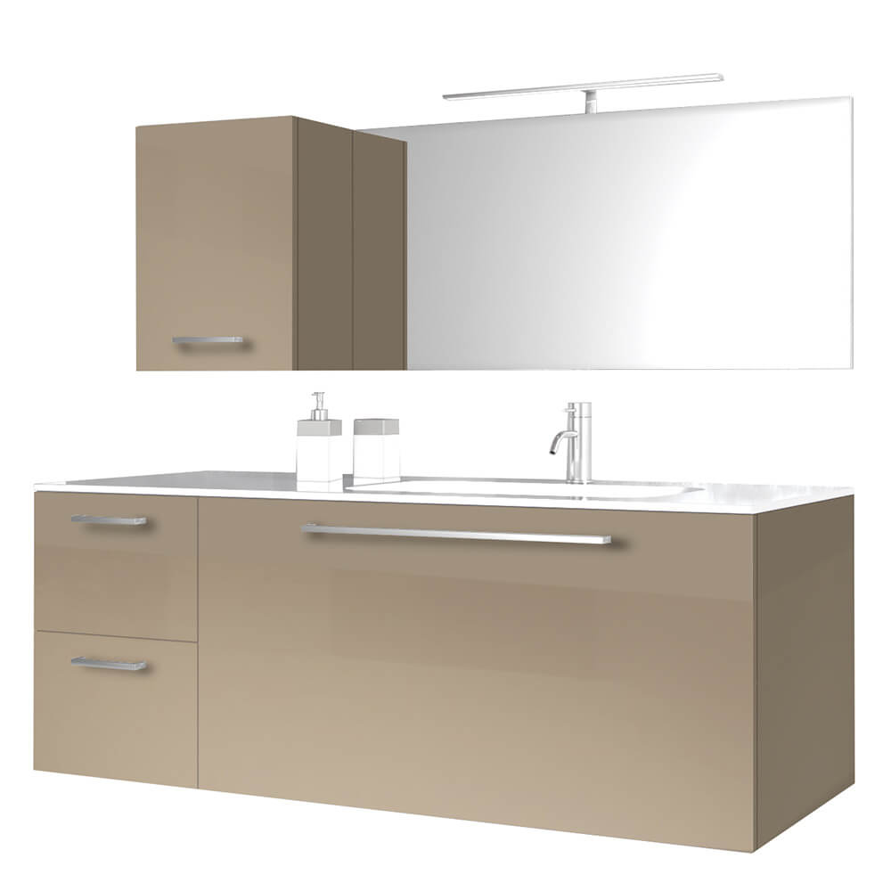 Moderne Badmöbel Samoa 01 komplett mit hängendem Unterschrank mit Korb, Aufsatz mit integriertem Stonelight-Waschbecken, eintürigem Schrank, Spiegel und LED-Leuchte.