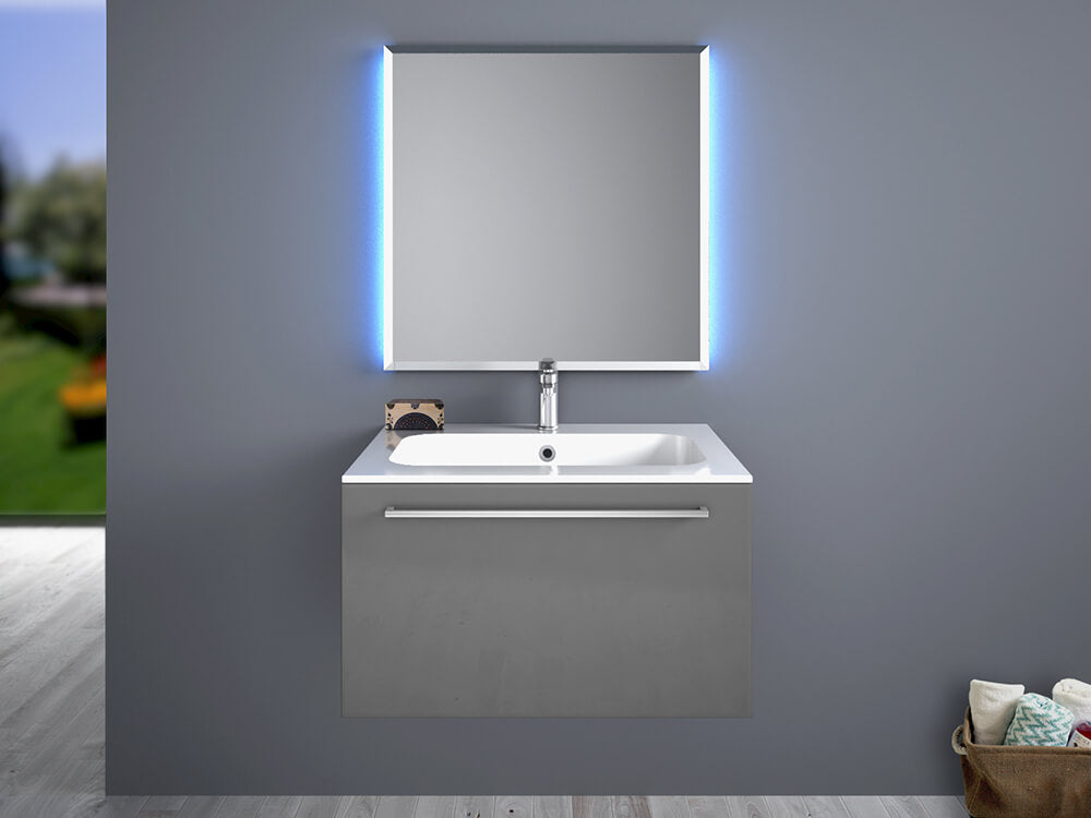 Samoa 04 moderne Badmöbel komplett mit hängendem Unterschrank mit einer Schublade, Platte mit integriertem Waschbecken und Spiegel mit zwei Kaltlicht-LED-Streifen.