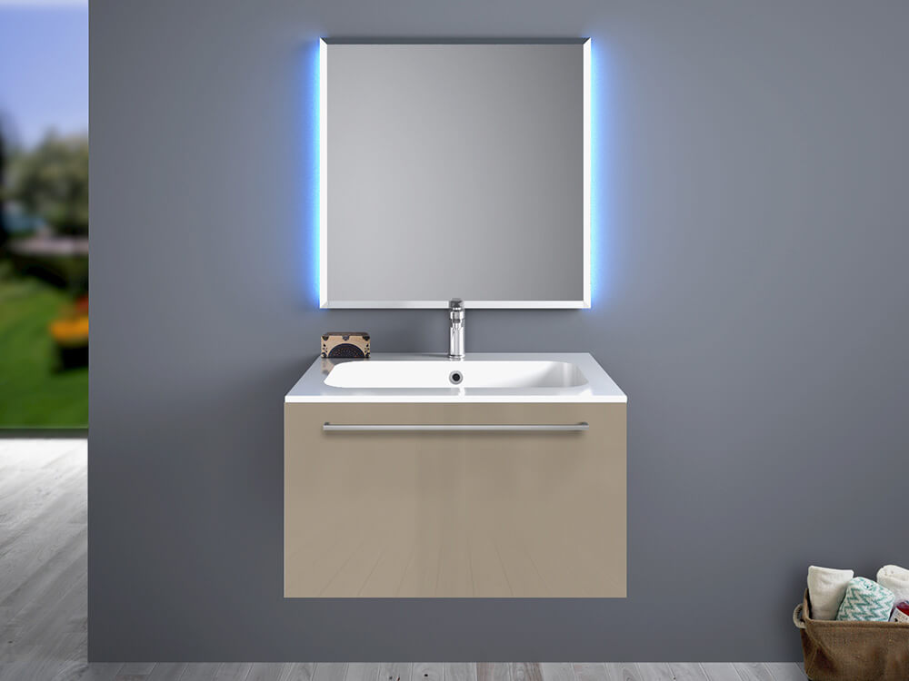 Samoa 04 moderne Badmöbel komplett mit hängendem Unterschrank mit einer Schublade, Platte mit integriertem Waschbecken und Spiegel mit zwei Kaltlicht-LED-Streifen.