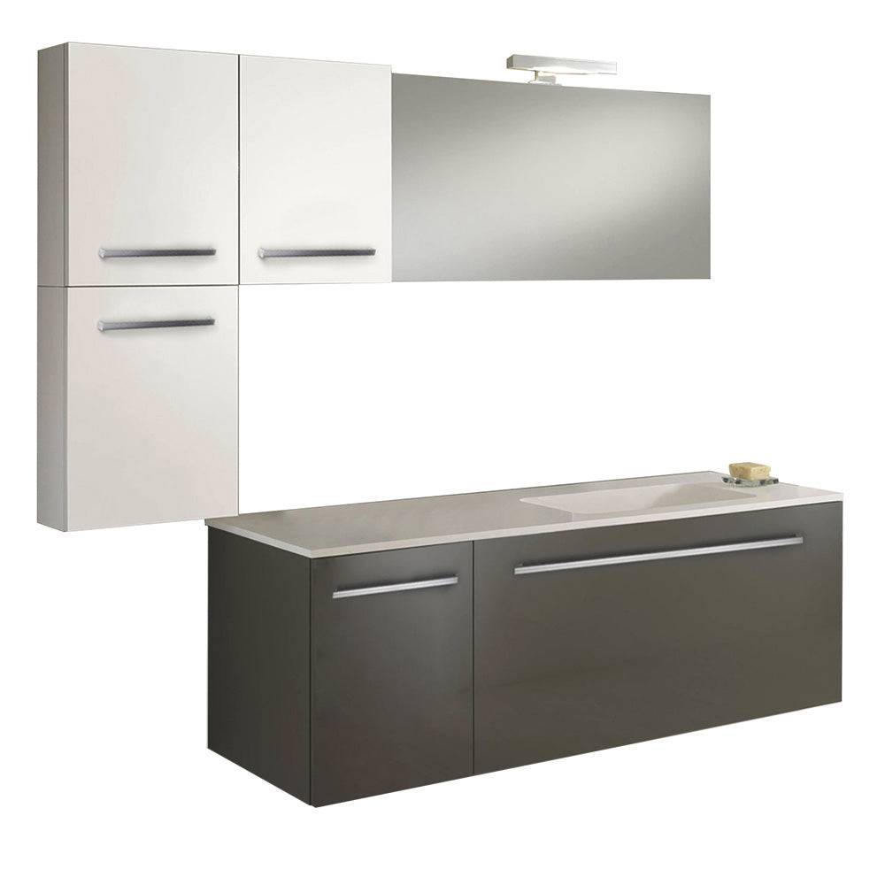 Moderne Badmöbel Samoa 09 komplett mit hängendem Unterschrank mit Schublade und Korb, drei Hängeschränken mit einer Tür, Stonelight-Top mit integriertem Waschbecken und Venus-Spiegel mit LED-Lampe.