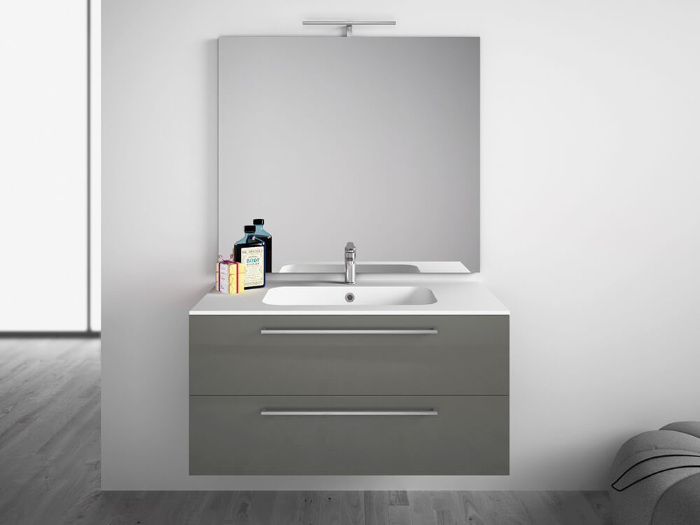 Samoa 10 moderne Badezimmermöbel komplett mit hängendem Unterschrank mit Doppelschublade, Platte mit integriertem Waschbecken und Spiegel mit LED-Lampe.