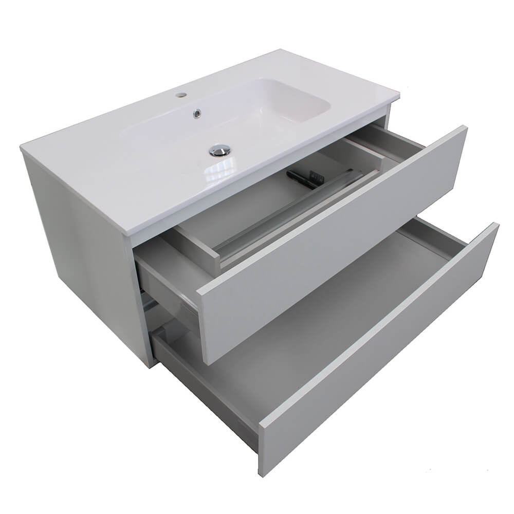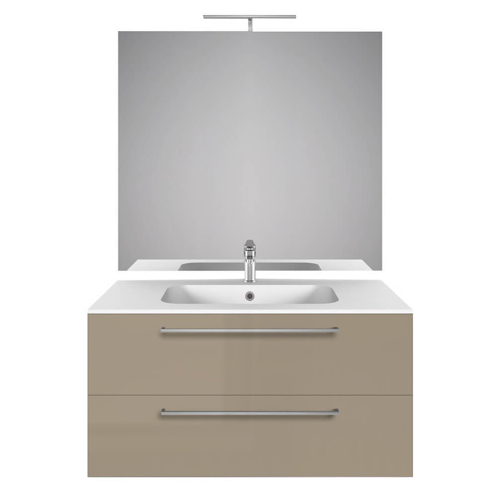 Samoa 10 moderne Badezimmermöbel komplett mit hängendem Unterschrank mit Doppelschublade, Platte mit integriertem Waschbecken und Spiegel mit LED-Lampe.