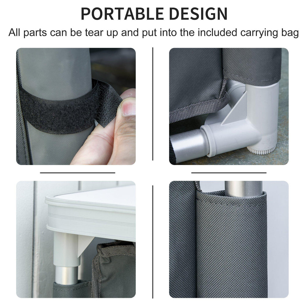 Der Camping-Küchenschrank ist der ideale Helfer für Ihre Outdoor-Mahlzeiten. Perfekt für Ihre Campingausrüstung, ein Picknick, Grillabende im Garten und jede andere Gelegenheit, bei der Sie eine feste Unterlage benötigen. Dieser Campingtisch verfügt über 2 Regale unter dem Regal, um Lebensmittel und Utensilien in Ordnung zu halten. Dank der abgerundeten Ecken sicher in der Anwendung und dank der mitgelieferten Tasche leicht zu transportieren.