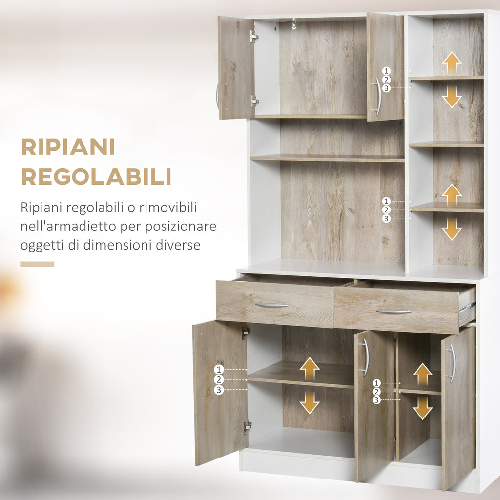 Das Küchen-Sideboard hat ein modernes Design, das sich in verschiedene Einrichtungsstile einfügt. Es hat 6 offene Fächer, 2 Schubladen und 3 Schränke mit Türen. Das kompakte Design dieses hohen Vorratsschranks macht ihn ideal für Küche und Wohnzimmer und bietet minimale Stellfläche und genügend Stauraum für alles, was Sie brauchen.