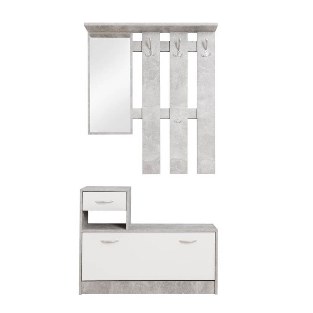 Guardaroba da ingresso con specchio, 3 ganci appendiabito e scarpiera, 1 vano aperto, 1 ripiano per cappelli. Dal design semplice e moderno offre molto spazio per appendere e riporre abiti, scarpe e borse. Dotato anche di un cassetto adatto come svuotatasche e per riporre piccoli oggetti. Le maniglie sono in materiale sintetico e i ganci in metallo.
