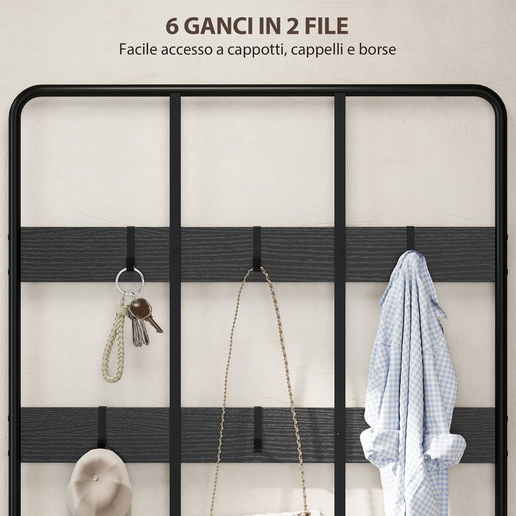• GANCI SU DUE FILE: L'appendiabiti da terra ha sei ganci distribuiti su due file, per offrire spazio abbondante per giacche, sciarpe, cappelli e borse, facilitando la routine quotidiana