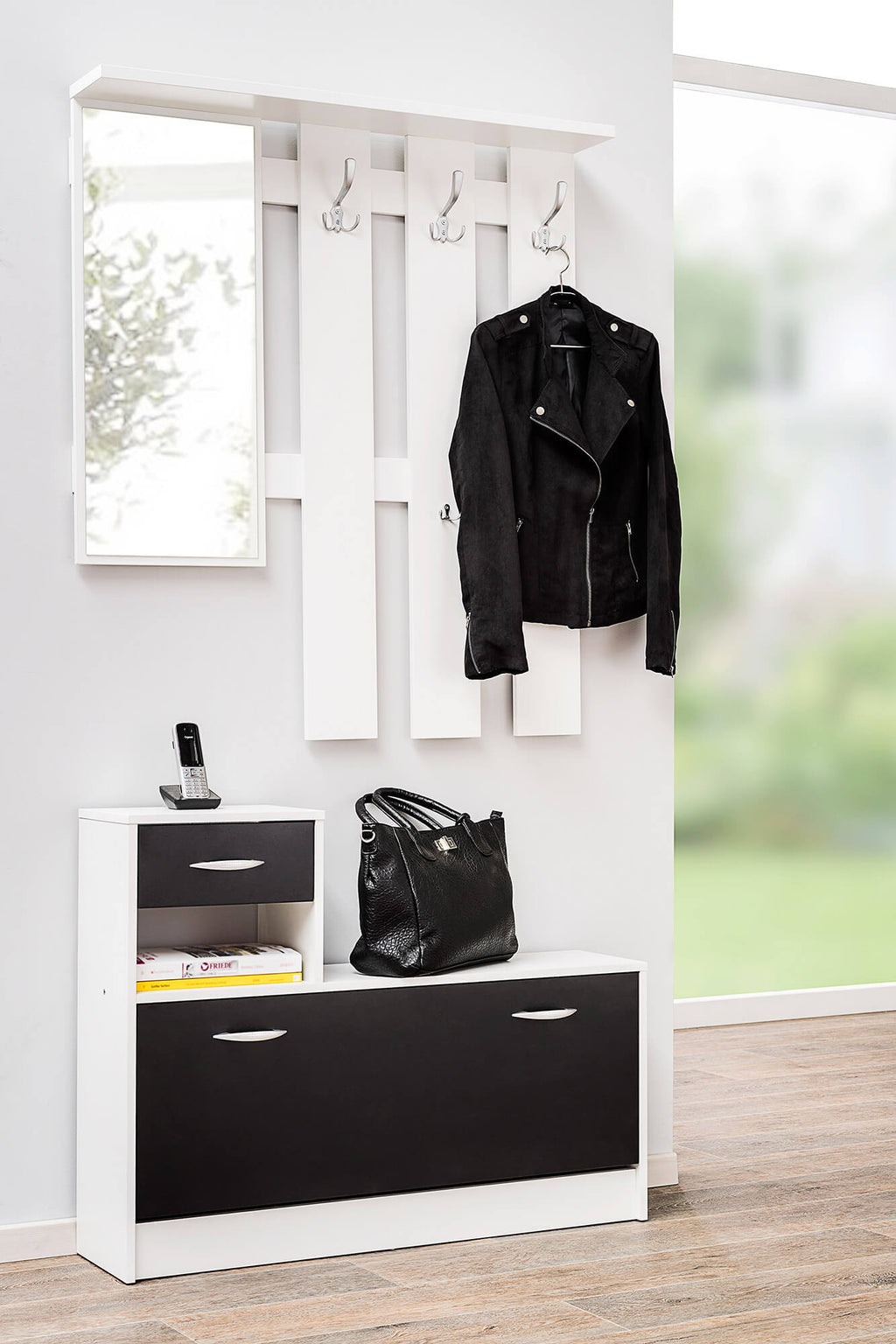 Flurgarderobe mit Spiegel und Schuhregal aus schwarzer und weißer Alfred-Spanplatte