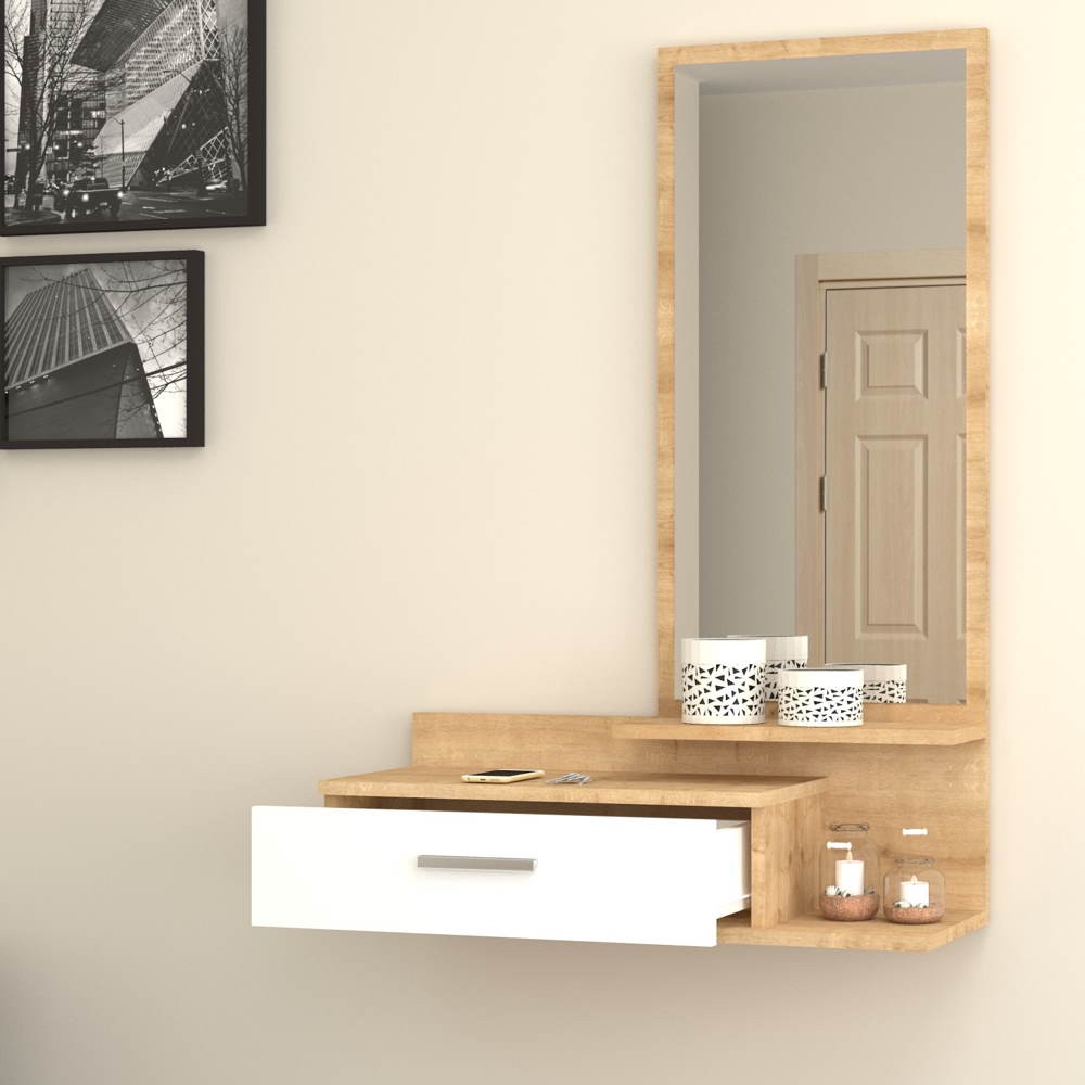 Mobile ingresso con specchio bianco rovere Joy. Ingresso pratico e funzionale, dotato di specchio, cassetto con colore a contrasto e comode superfici d’appoggio.