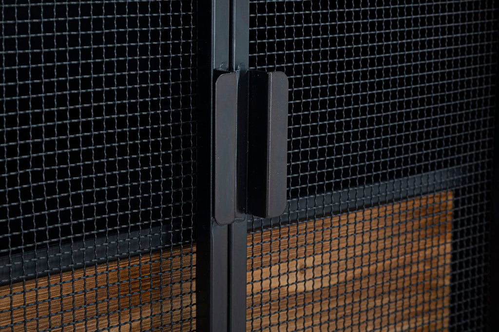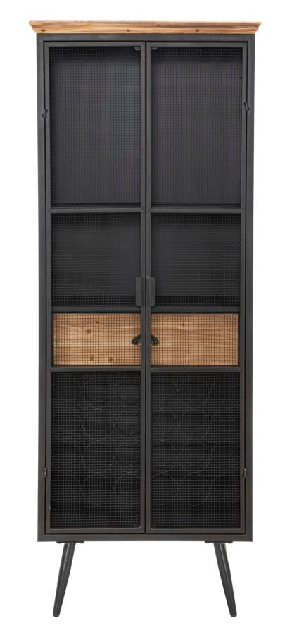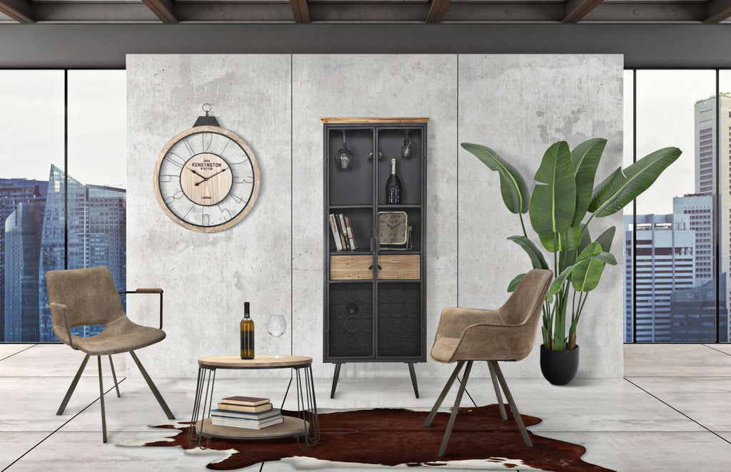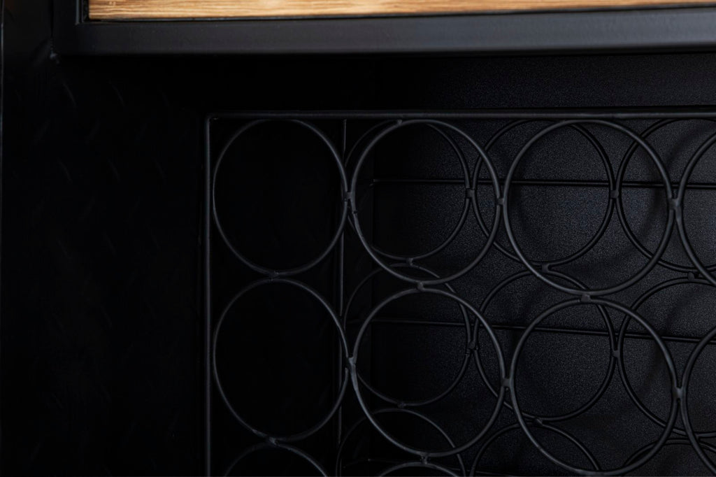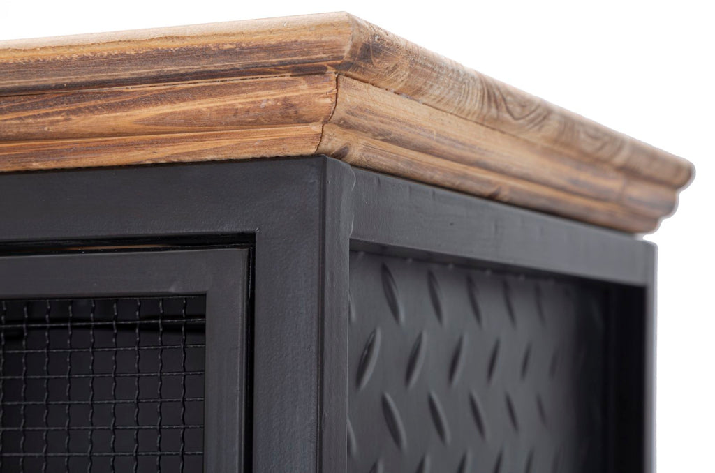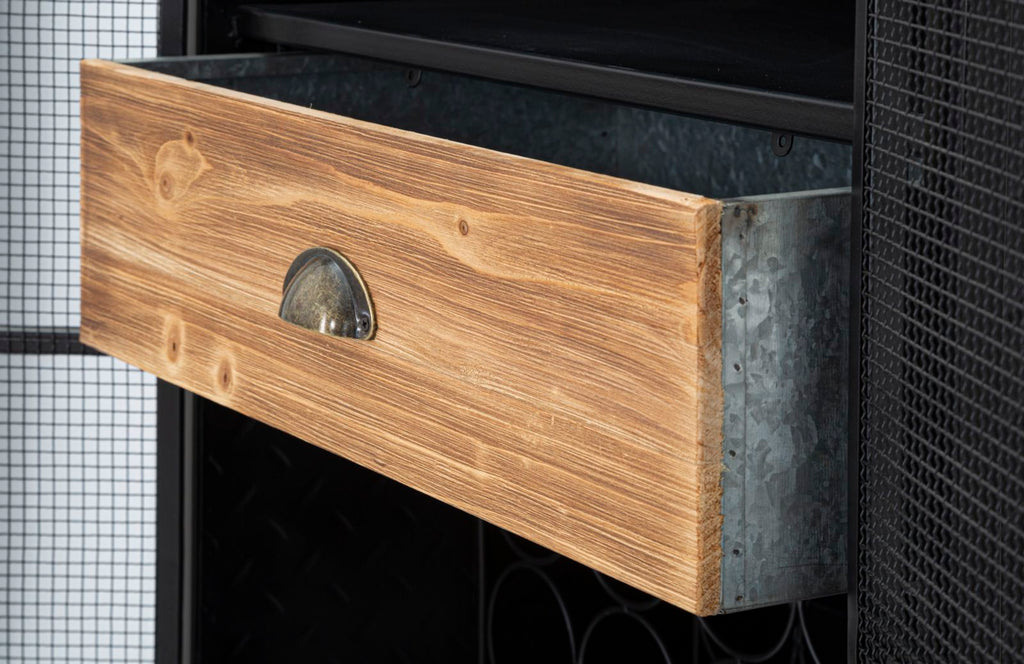 Schrank im Industriestil mit zwei Türen aus Mesh. Im Inneren befindet sich eine Holzschublade in der Mitte, 2 Regale im oberen Teil und ein spezieller Flaschenhalter im unteren Teil. Die entschiedenen, aber eckigen Linien und die besondere Verarbeitung verleihen jeder Umgebung einen Hauch von Einzigartigkeit, ohne auf Nüchternheit zu verzichten.