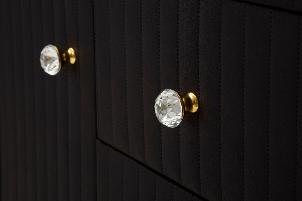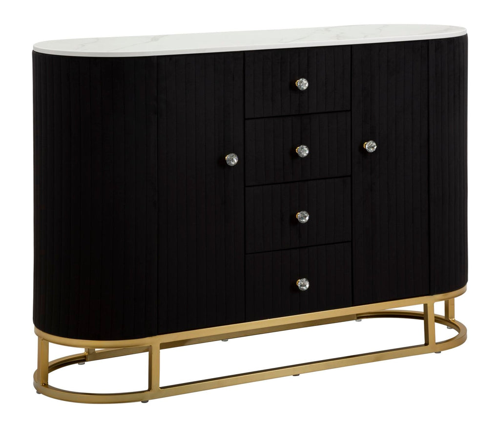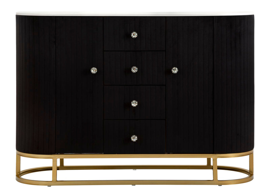 Questo mobile dal design raffinato presenta lati smussati e offre ampio spazio di archiviazione con 2 ante e 4 cassetti. La struttura in metallo dorato dona un tocco di pregio, mentre la parte superiore rivestita in tessuto imbottito nero aggiunge comfort e sofisticatezza. Il piano realizzato in simil marmo crea un elegante contrasto, rendendo questo mobile versatile e adattabile a qualsiasi stile di arredamento.