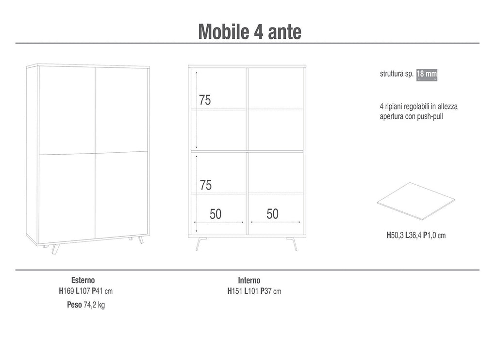 Mobile Multiuso 4 Ante 107x169x41 cm Cemento/Bianco Lucido