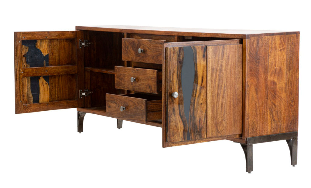 Eleganter Schrank aus massivem Akazienholz, bestehend aus 2 Türen und 2 Schubladen. Die besondere Verarbeitung mit Harz auf den Türen verleiht einem äußerst eleganten und klassischen Stück einen Hauch von Farbe und Modernität.