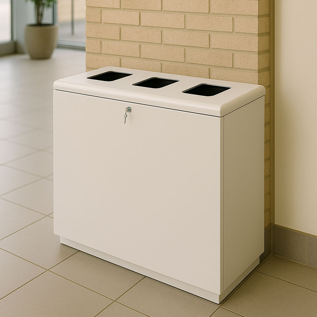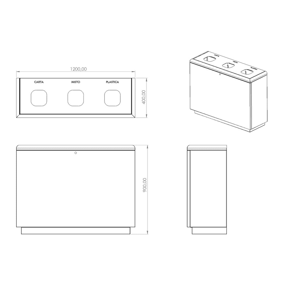 Mobili per la raccolta differenziata in acciaio verniciato 3 scomparti. Organizza con stile. Differenzia con efficienza. Stanco dei soliti bidoni disordinati in casa o sul balcone? Questo mobile per la raccolta differenziata è la soluzione definitiva per gestire plastica, carta, vetro e organico con stile ed efficienza. Realizzato interamente in Italia, è perfetto per ambienti interni ed esterni grazie alla sua struttura in acciaio verniciato professionale. Mobile raccolta differenziata 3 scomparti (240L) in lamiera verniciata, con sportello anteriore. Adatto per interni ed esterni, design moderno, made in Italy. Perfetto come mobiletto raccolta differenziata per casa o balcone.